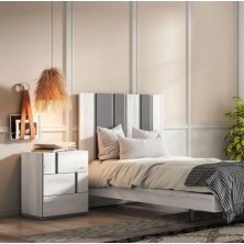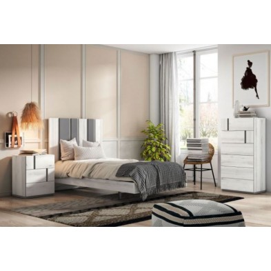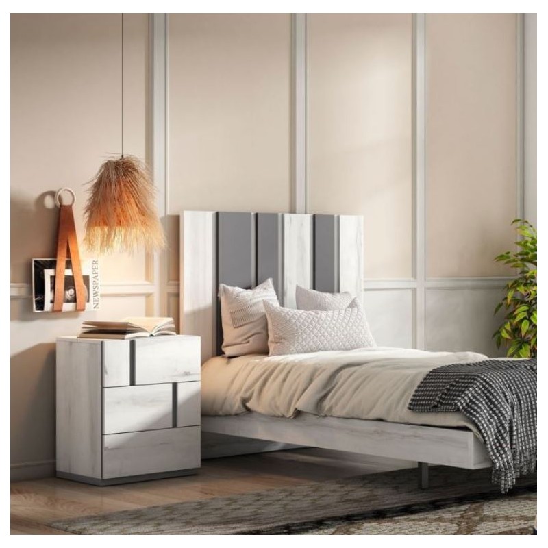 Dormitorio Juvenil Nilo, fabricado en material laminado de primera calidad, en acabado Albo combinado en color Gris Tormenta. Los tiradores en acabado gris aportan elegancia. Está compuesto por cabecero y mesitas de 3 cajones. Ofrece la posibilidad de modificar los colores de terminación, medidas, así como añadir cómoda, sinfonier y armario. Se sirve premontado.
