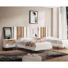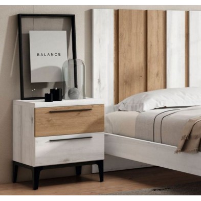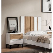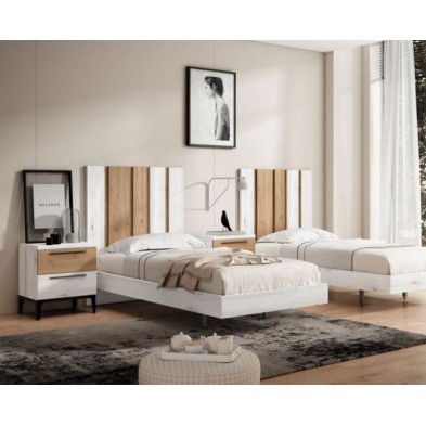 Dormitorio Juvenil Nilo, fabricado en material laminado de primera calidad, en acabado Albo combinado en color Naturale. Los tiradores en acabado grafito aportan elegancia. Está compuesto por cabecero y mesitas de 2 cajones con patas altas. Ofrece la posibilidad de modificar los colores de terminación, medidas, así como añadir cómoda, sinfonier y armario. Se sirve premontado.