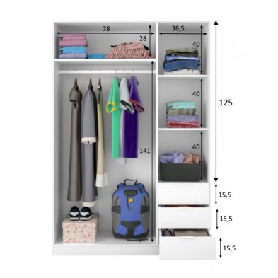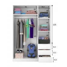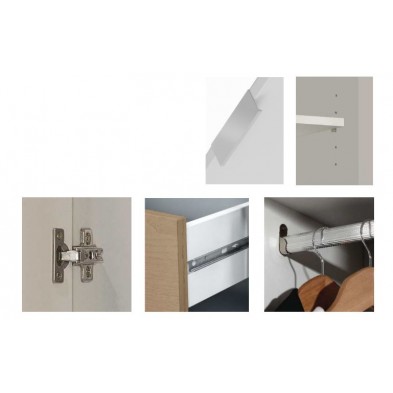 Armario fabricado en melamina de alta calidad, en acabado blanco, combinado a la perfección para un resultado impecable. Sus tiradores son de aluminio gris. El interior está compuesto por barra de colgar y altillo en el lado izquierdo, en el lado derecho está compuesto por estantes y cajones. Ideal para utilizar de almacenamiento, de gran capacidad.