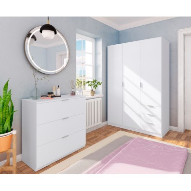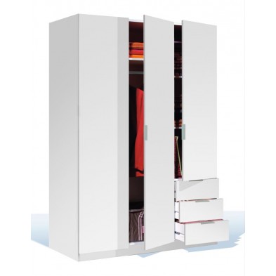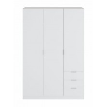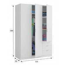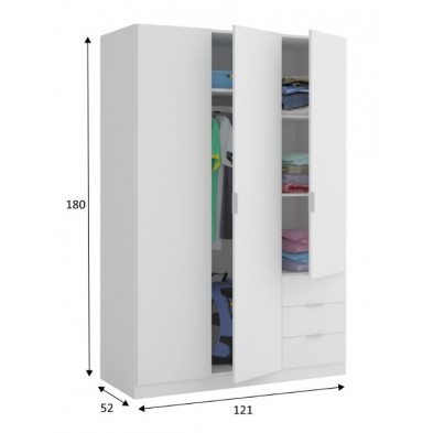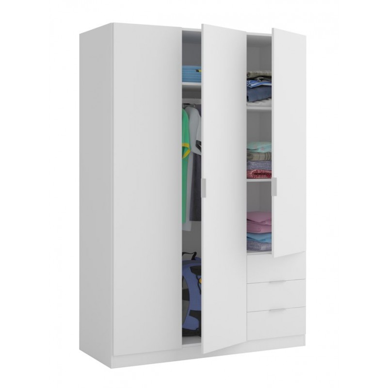 Armario fabricado en melamina de alta calidad, en acabado blanco. Compuesto de 3 puertas Y 3 cajones, con barra de colgar, altillo y estantes en su interior. Tirador de aluminio color gris. Podrás crear un ambiente acogedor, ya que es de fácil combinación gracias a sus acabados. Con guías, bisagras y soportes metálicos. Fabricado en España, con 2 años de garantía.