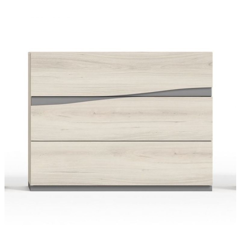 Cómoda de 3 Cajones Nilo, fabricado en material laminado de primera calidad, en acabado Shamal combinado en color Gris Tormenta. Los tiradores están en el frente del cajón con detalles en gris tormenta. Ofrece la posibilidad de modificar los colores de terminación, medidas, así como añadir otros artículos para completar el dormitorio. Se sirve premontado.