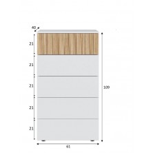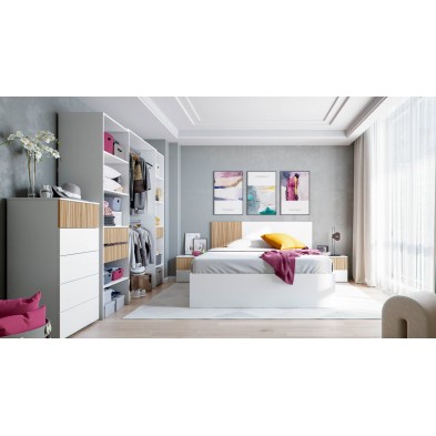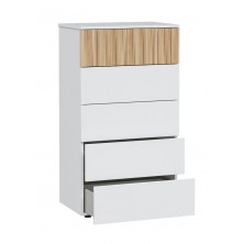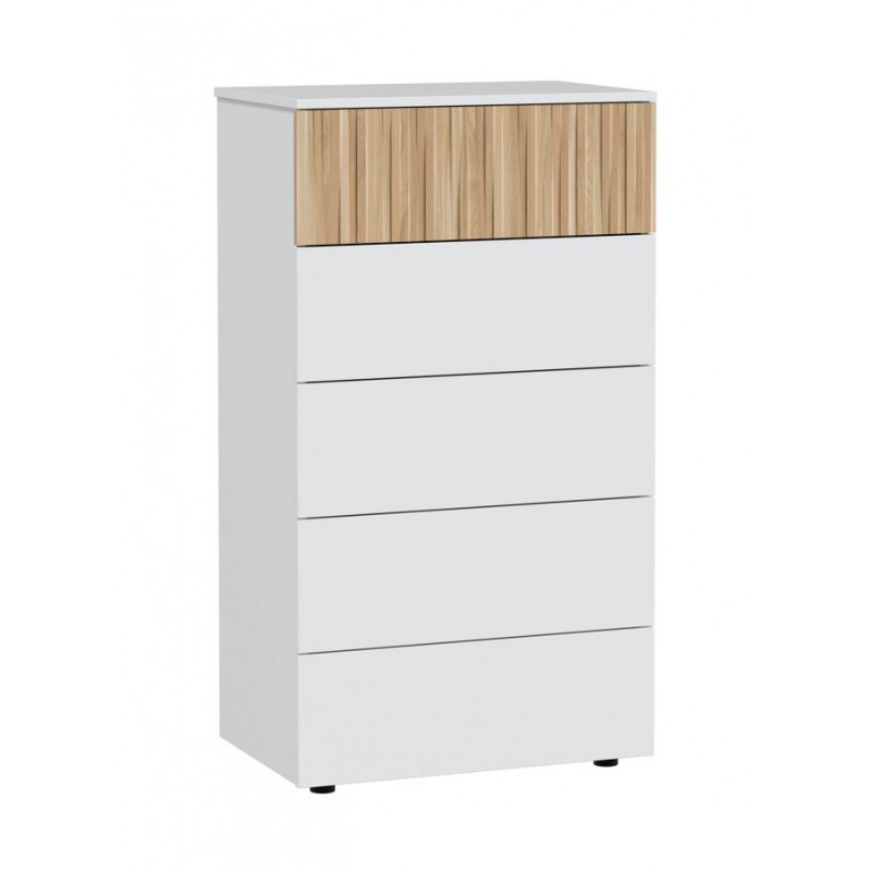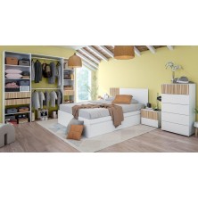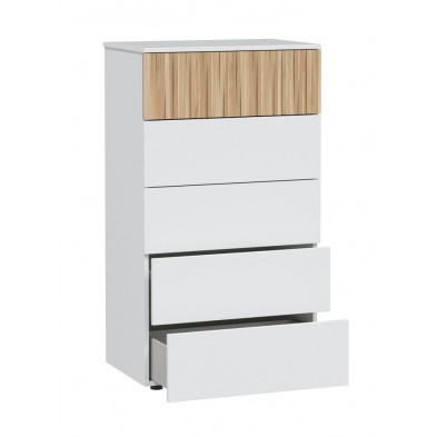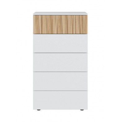 Cómoda Ethna de gran capacidad para almacenar, compuesta por 5 cajones amplios. Fabricada en melamina de alta calidad, en acabado Blanco Artik y Natur. Destaca por su diseño actual de palitos, cuidando hasta el último detalle. Disponible el resto de la colección en nuestra web, podrás combinar y conseguir un dormitorio moderno y actual. Fabricado en España, 2 años de garantía.