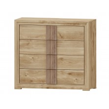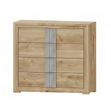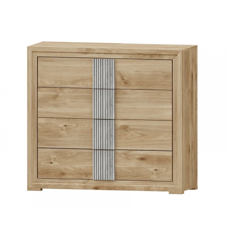 La cómoda Turín se compone 4 cajones, opcionalmente se puede añadir mesitas, cabecero, sinfonier, espejo, armario... Ideal para ambientes de medidas reducidas. En ella, se fusionan los tonos Roble, con detalles en varios acabados, roble o blanco nieve. Aportando elegancia, amplitud, y luminosidad, a la estancia donde se coloque. Se trata módulos con pata, que permiten su montaje con distinta distribución, para poder conseguir la composición deseada.