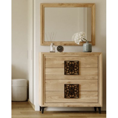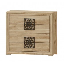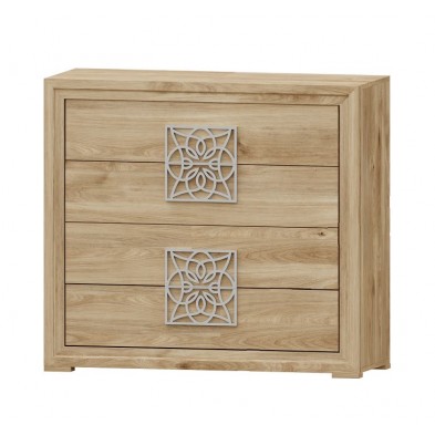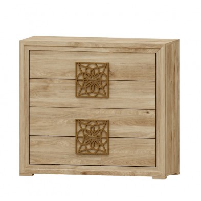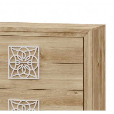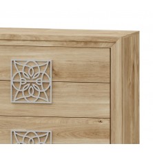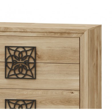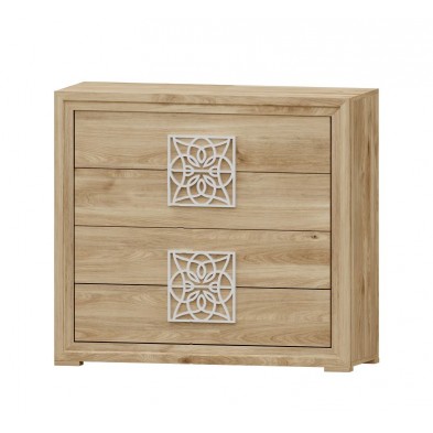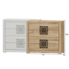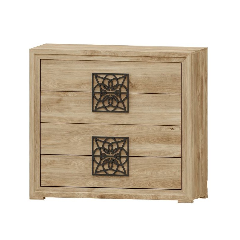 La cómoda Turín se compone 4 cajones, opcionalmente se puede añadir mesitas, cabecero, sinfonier, espejo, armario... Ideal para ambientes de medidas reducidas. En ella, se fusionan los tonos Roble, con detalles en varios acabados, negro, blanco, oro, plata. Aportando elegancia, amplitud, y luminosidad, a la estancia donde se coloque. Se trata módulos con pata, que permiten su montaje con distinta distribución, para poder conseguir la composición deseada.