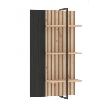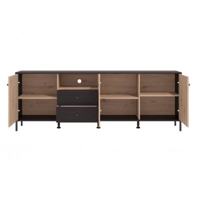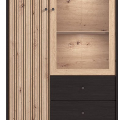 Composición de salón Tania, fabricada en laminado sintético, con estructura en acabado Ébano y detalles con alistonados en Roble Artisan. Está compuesta por mueble tv + vitrina + estantería. Los tiradores y las patas son de color negro, aportando calidad al mueble. Diseño moderno y actual, fácil de combinar gracias a sus acabados.