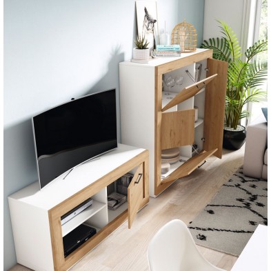 Composición de salón Geminis, con estructura fabricada en color Blanco Mate, combinado con Natural. Está compuesta por Bajo TV de 126 cm., y Aparador de 4 Puertas + Hueco de 126 cm. Ofrece la posibilidad de modificar los colores de terminación, medidas, así como añadir o quitar módulos. Se sirve premontado.