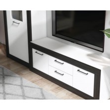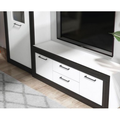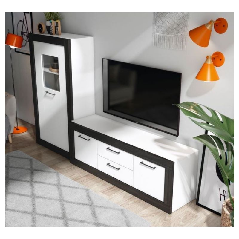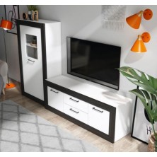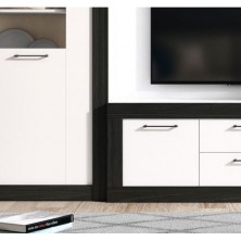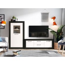 Composición de salón Geminis, con estructura fabricada en color Blanco Mate, combinando los marcos en Bocamina y detalles en grafito. Está compuesta por Bajo TV de 154 cm, y Vitrina baja de 1 Puerta de cristal. Ofrece la posibilidad de modificar los colores de terminación, medidas, así como añadir o quitar módulos. Se sirve premontado.