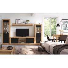 Composición de salón Geminis, con estructura fabricada en color Naturale, combinado en Bocamina y tiradores en grafito. Está compuesta por Bajo TV de 181 cm, Estante, Vitrina alta y Vitrina Baja 1 Puerta de cristal. Ofrece la posibilidad de modificar los colores de terminación, medidas, así como añadir o quitar módulos. Se sirve premontado.