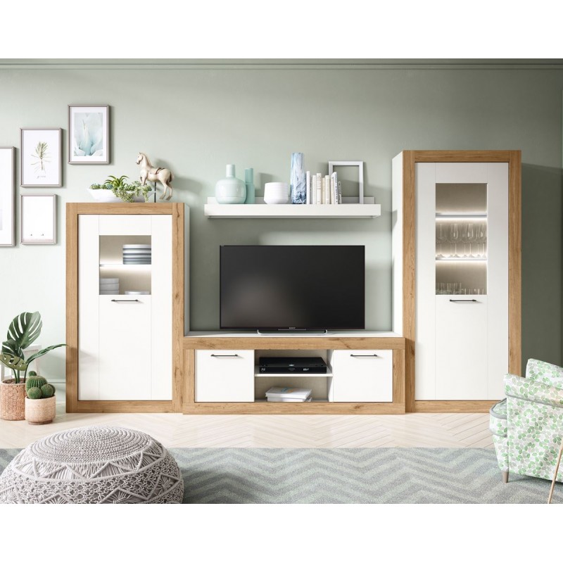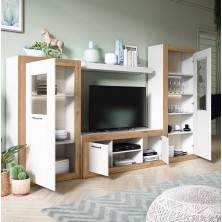 Composición de salón Geminis, con estructura fabricada en color Blanco Mate, combinando marcos en naturale y detalles en grafito. Está compuesta por Bajo TV de 154 cm, Vitrina de 1 Puerta de cristal baja, Estante y Vitrina 1 Puerta alta. Ofrece la posibilidad de modificar los colores de terminación, medidas, así como añadir o quitar módulos. Se sirve premontado.