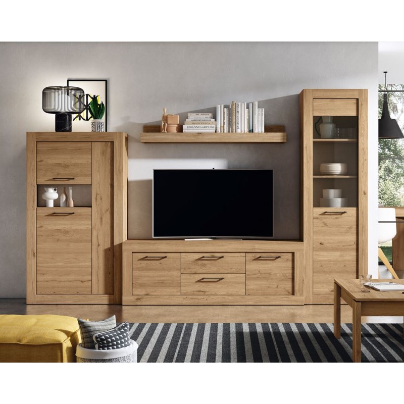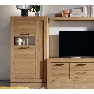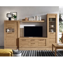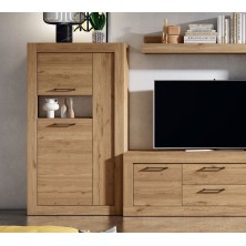 Composición de salón Geminis, con estructura fabricada en color Naturale y tiradores en grafito. Está compuesta por Bajo TV de 154 cm, Estante, Vitrina alta de cristal y Módulo bajo de 3 Puertas. Ofrece la posibilidad de modificar los colores de terminación, medidas, así como añadir o quitar módulos. Se sirve premontado.