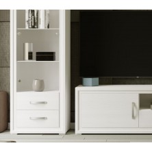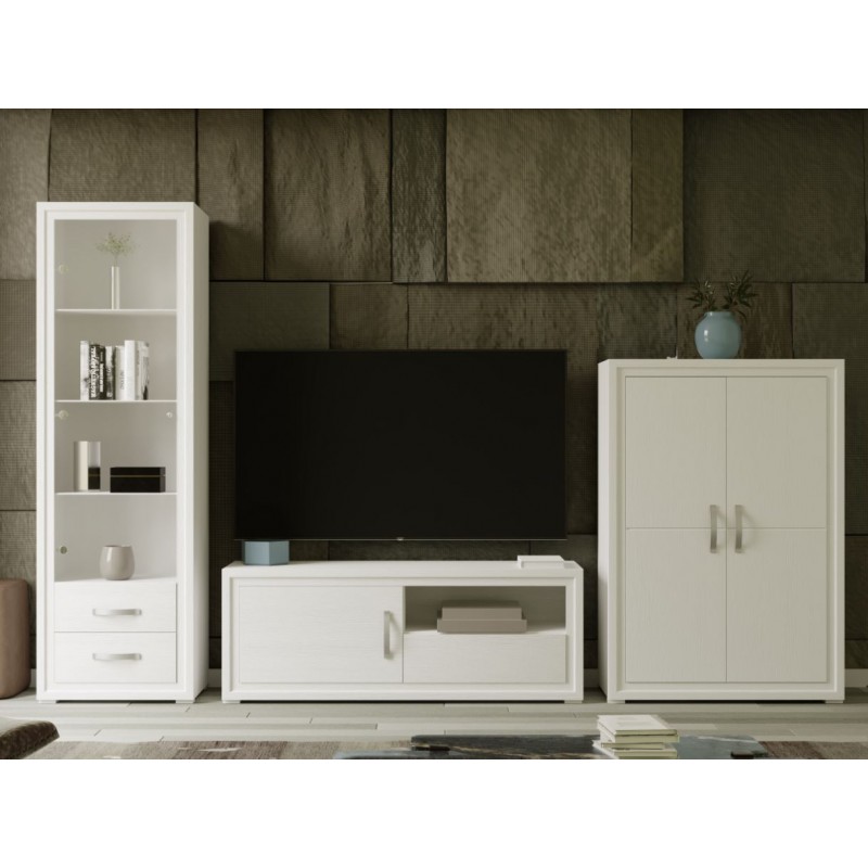 La Composición de Salón Turín, destaca principalmente por su estilo elegante y sofisticado, de líneas rectas y sencillas. Está compuesta por Mueble TV 140 cm., Vitrina de 1 Puerta de 53 cm., y Bajo Bodeguero de 90 cm. Color Blanco Polar, con detalles de tirador en Plata. Gracias a sus colores se consigue gran luminosidad y amplitud, con ese toque sencillo que lo hace único.