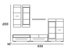 Composición de Salón Vusher, acabada en laminado sintético color roble y detalles negros con frentes curvos, cajones con cristal combinado y tiradores de PVC aluminio. Compuesta por dos módulos colgantes con leds incluidos, módulo vitrina, estante y módulo TV. Mueble tipo kit.