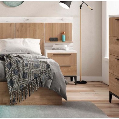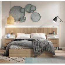 Dormitorio Nilo, fabricado en material laminado de primera calidad, en acabado Albo combinado en color naturale. Los tiradores y las patas en acabado grafito aportan elegancia. Está compuesto por cabecero y mesitas de 2 cajones con patas altas. Ofrece la posibilidad de modificar los colores de terminación, medidas, así como añadir cómoda, sinfonier y armario. Se sirve premontado.