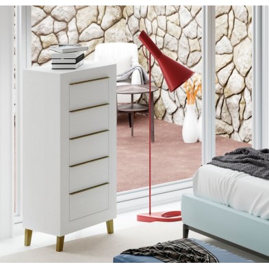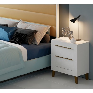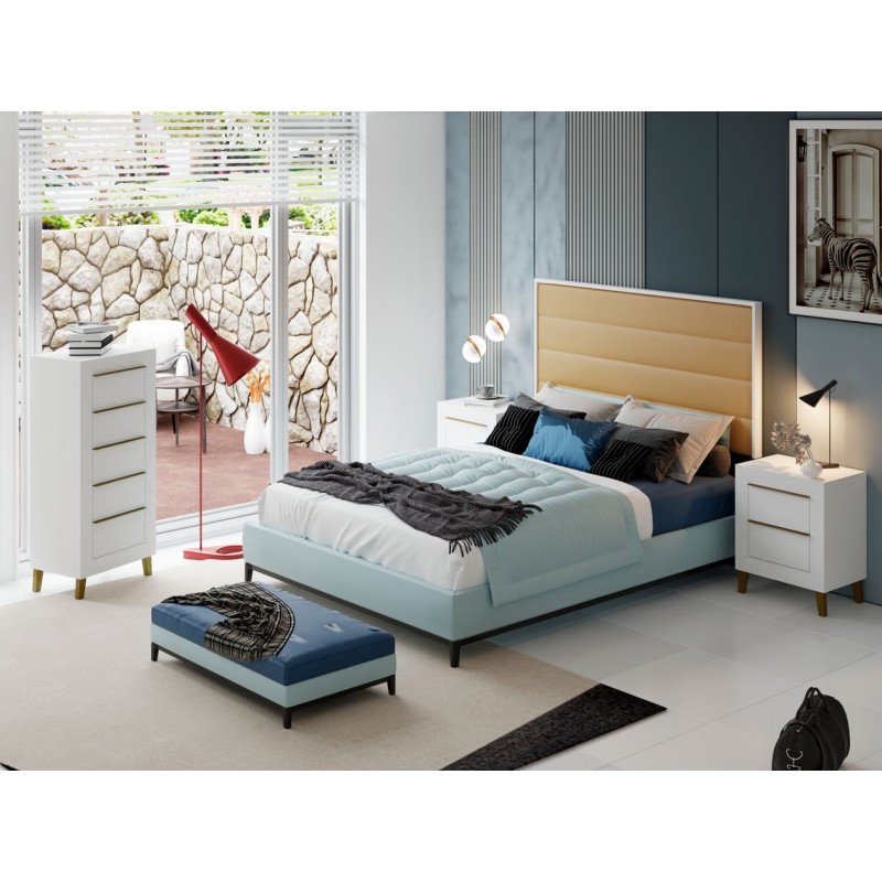 El dormitorio Niza es elegante y sofisticado, está compuesto por Cabecero y 2 mesitas de 2 cajones, opcionalmente puede adquirir Sinfonier y Espejo. Está terminado en color Blanco Nieve, combinando tiradores y patas en oro. El cabecero está tapizado en polipiel color oro. Se trata de un dormitorio de estilo moderno y elegante, gracias a sus colores se consigue tener una estancia agradable. Fabricado en material de primera calidad.