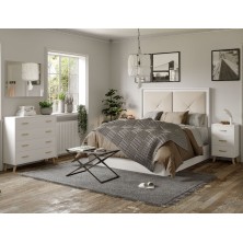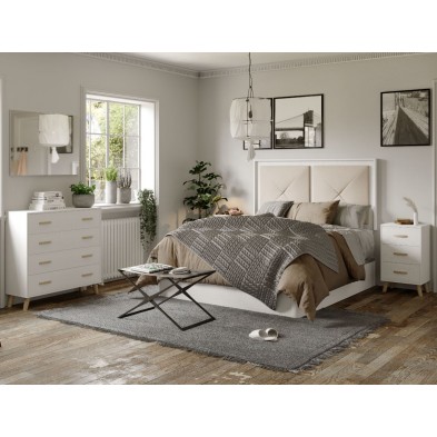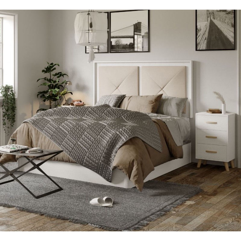 El dormitorio Nórdico, está compuesto por Cabecero y 2 mesitas de 3 cajones, opcionalmente puede adquirir Cómoda y Espejo. Está terminado en color Blanco Nieve, combinando tiradores y patas en roble. El cabecero está tapizado en tejido color lino. Se trata de un dormitorio de estilo moderno y elegante, gracias a sus colores se consigue gran luminosidad y amplitud. Fabricado en material de primera calidad.