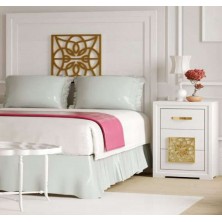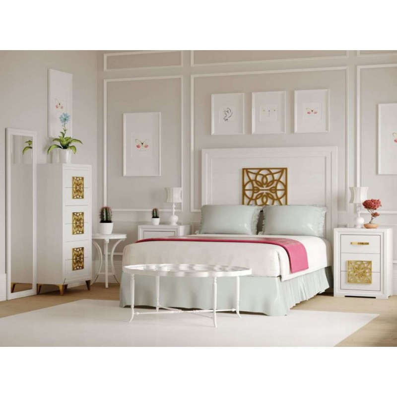 El dormitorio Turin se compone de cabecero y 2 mesitas de 3 cajones, opcionalmente se puede añadir sinfonier y espejo. Ideal para ambientes de medidas reducidas. En ella, se fusionan los tonos Blanco Nieve, con detalles en dorado, aportando elegancia, amplitud, y luminosidad, a la estancia donde se coloque. Se trata módulos con pata, que permiten su montaje con distinta distribución, para poder conseguir la composición deseada.