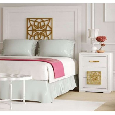 El dormitorio Turín, está compuesto por Cabecero y 2 mesitas de 3 cajones, opcionalmente puede adquirir Sinfonier y Espejo. Está terminado en color Blanco Nieve, con detalles en el cabecero y tiradores tipo mandala color dorado. Se trata de un dormitorio de estilo moderno y elegante, gracias a sus colores se consigue gran luminosidad y amplitud. Fabricado en material de primera calidad.