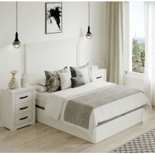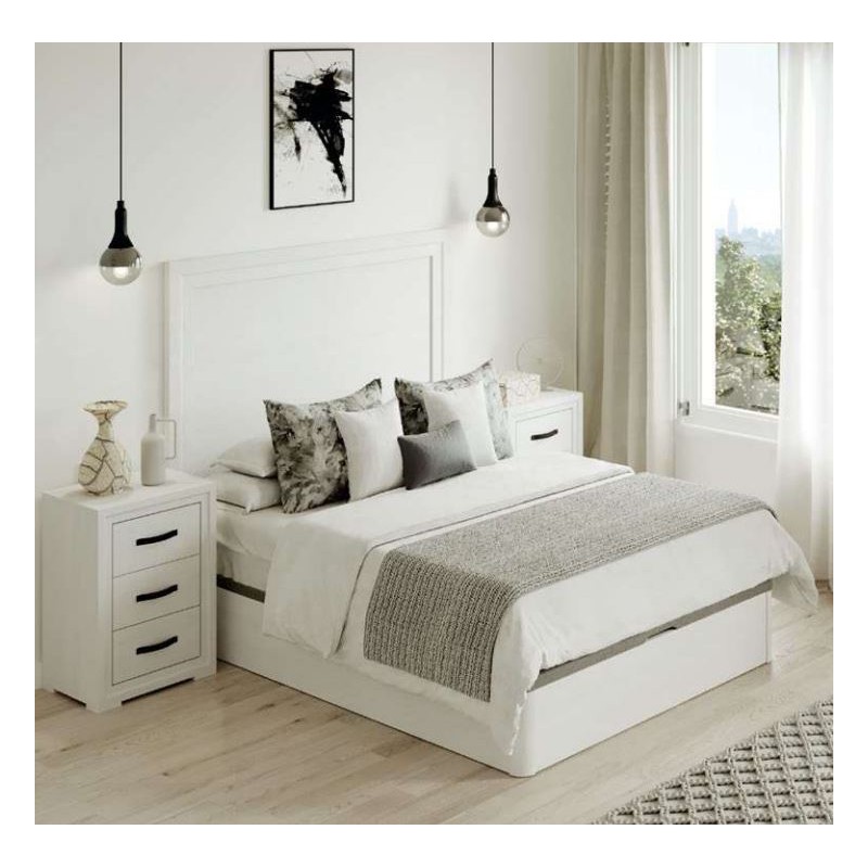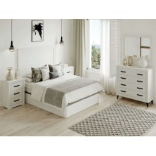 El dormitorio Turín, está compuesto por Cabecero y 2 mesitas de 3 cajones, opcionalmente puede adquirir Cómoda y Espejo. Está terminado en color Blanco Nieve, con detalles en color negro. Se trata de un dormitorio de estilo moderno y elegante, gracias a sus colores se consigue gran luminosidad y amplitud. Fabricado en material de primera calidad.