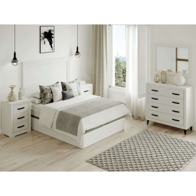 El dormitorio Turin se compone de cabecero y 2 mesitas de 3 cajones, opcionalmente se puede añadir cómoda y espejo. Ideal para ambientes de medidas reducidas. En ella, se fusionan los tonos Blanco Nieve, con detalles en negro, aportando elegancia, amplitud, y luminosidad, a la estancia donde se coloque. Se trata módulos con pata, que permiten su montaje con distinta distribución, para poder conseguir la composición deseada.