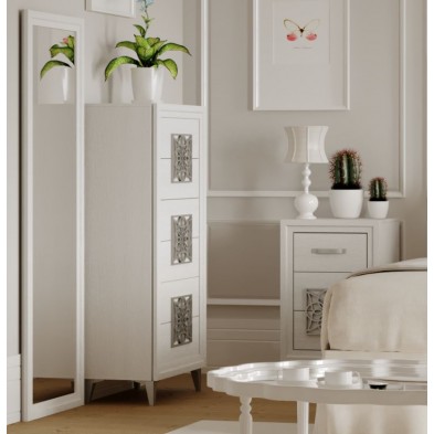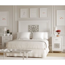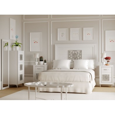 El dormitorio Turin se compone de cabecero y 2 mesitas de 3 cajones, opcionalmente se puede añadir sinfonier y espejo. Ideal para ambientes de medidas reducidas. En ella, se fusionan los tonos Blanco Nieve, con detalles en plata, aportando elegancia, amplitud, y luminosidad, a la estancia donde se coloque. Se trata módulos con pata, que permiten su montaje con distinta distribución, para poder conseguir la composición deseada.