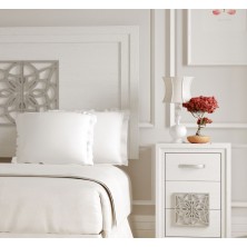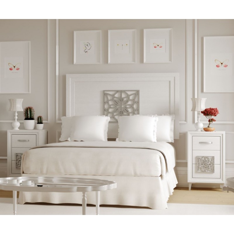 El dormitorio Turín, está compuesto por Cabecero y 2 mesitas de 3 cajones, opcionalmente puede adquirir Sinfonier y Espejo. Está terminado en color Blanco Nieve, con detalles en el cabecero y tiradores tipo mandala color plata. Se trata de un dormitorio de estilo moderno y elegante, gracias a sus colores se consigue gran luminosidad y amplitud. Fabricado en material de primera calidad.