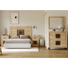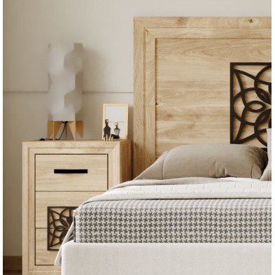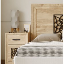El dormitorio Turín, está compuesto por Cabecero y 2 mesitas de 3 cajones, opcionalmente puede adquirir Cómoda y Espejo. Está terminado en color Roble, con detalles en el cabecero y tiradores tipo mandala color negro. Se trata de un dormitorio de estilo moderno y elegante, gracias a sus colores se consigue gran luminosidad y amplitud. Fabricado en material de primera calidad.