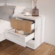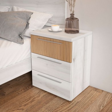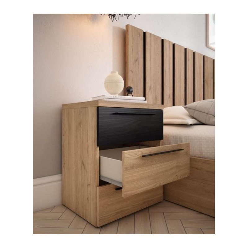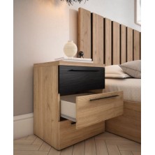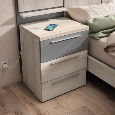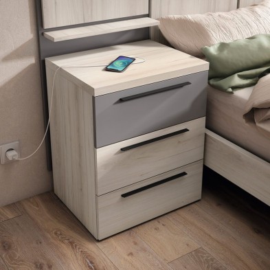 Mesita de noche Nilo, fabricada en material laminado de primera calidad, con tres amplios cajones, ideales para el almacenaje de todo lo que necesites. Los tiradores se pueden seleccionar en acabado grafito, o cromado. Ofrece la posibilidad de modificar los colores de terminación, medidas, así como completar el dormitorio con el resto de la colección. Se sirve premontada.