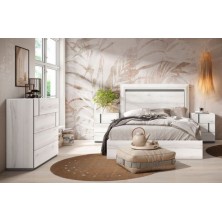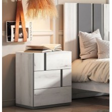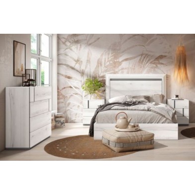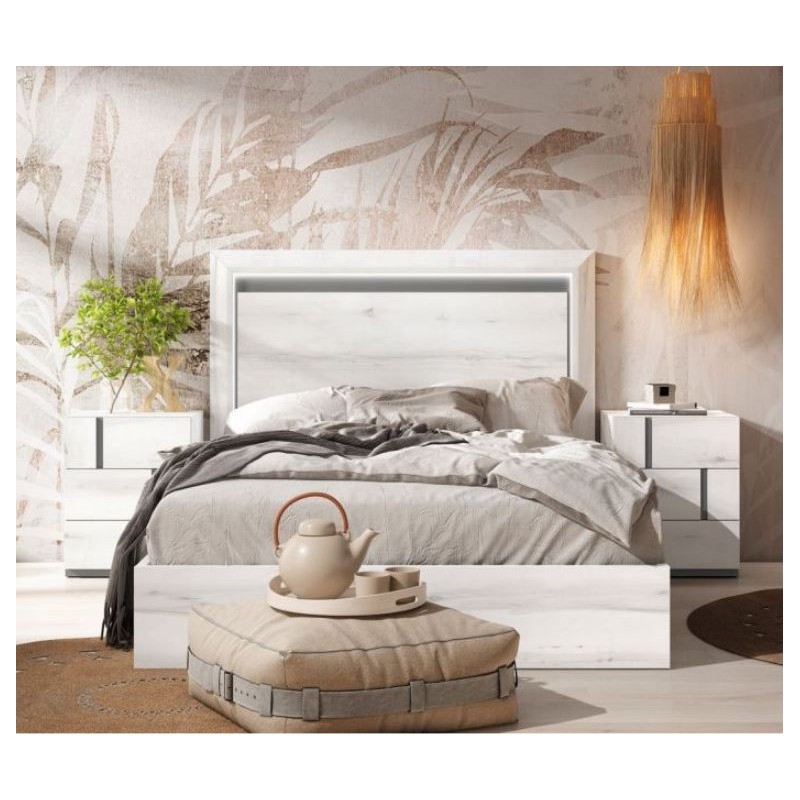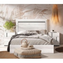 Dormitorio Nilo, fabricado en material laminado de primera calidad, en acabado Albo combinado en color Gris Tormenta. Los tiradores están en el frente del cajón aportando elegancia. Está compuesto por cabecero y mesitas de 3 cajones. Ofrece la posibilidad de modificar los colores de terminación, medidas, así como añadir cómoda, sinfonier y armario. Se sirve premontado.