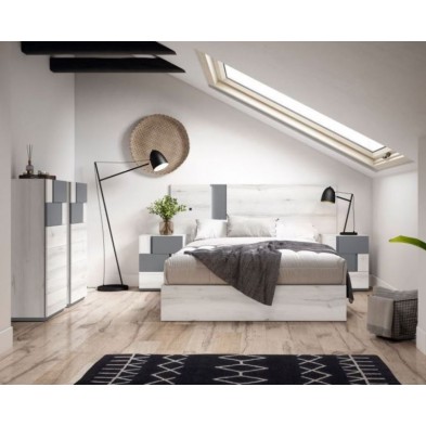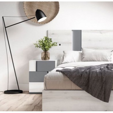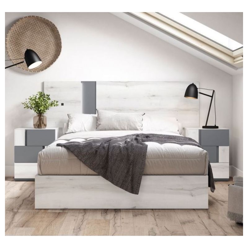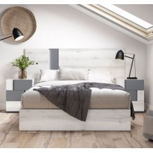 Dormitorio Matrimonio Nilo, fabricado en material laminado de primera calidad, en acabado Albo combinado en color Gris Tormenta. Los tiradores están en el frente del cajón. Está compuesto por cabecero y mesitas de 3 cajones a suelo. Ofrece la posibilidad de modificar los colores de terminación, medidas, así como añadir cómoda, sinfonier y armario. Se sirve premontado. Incluye luces LED en el cabecero. **