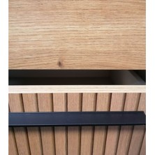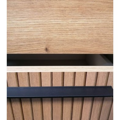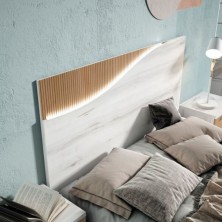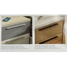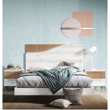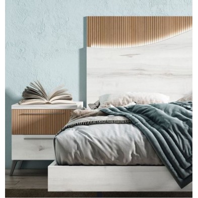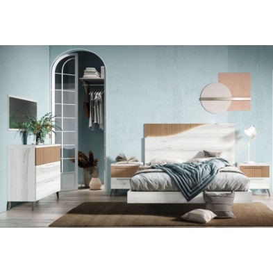 Dormitorio Nilo, fabricado en material laminado de primera calidad, en acabado Albo combinado en color Naturale rayado. Los tiradores en acabado cromado aportan elegancia. Está compuesto por cabecero y mesitas de 2 cajones. Ofrece la posibilidad de modificar los colores de terminación, medidas, así como añadir cómoda, sinfonier y armario. Se sirve premontado.