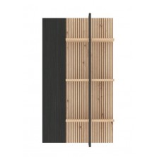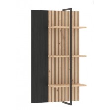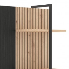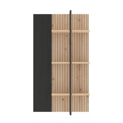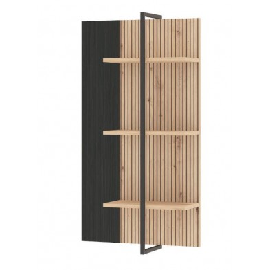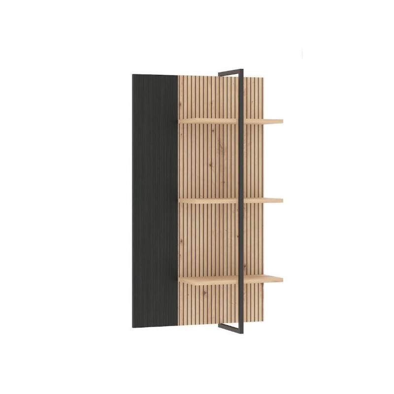 Estante Tania, compuesto por 3 estantes a diferentes alturas. La trasera está combinada en acabado Ébano y alistonados en Roble Artisan. Los estantes están cogidos por una pieza metálica en color negro, aportando estabilidad. Diseño moderno y actual, fácil de combinar gracias a sus acabados.