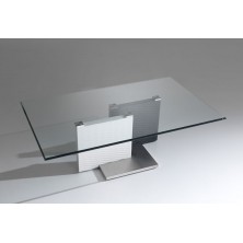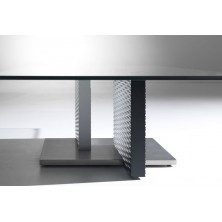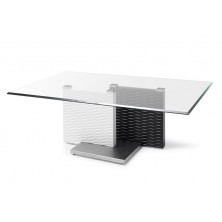 La mesa de centro modelo Cebra presenta un sofisticado diseño, con una estructura en MDF en relieve en blanco y negro mate lacado, la base es de acero inoxidable y el cristal es de 12 mm templado con terminación en canto de diamante.
