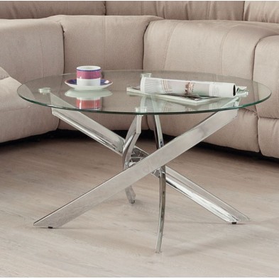 Mesa de centro Deli, compuesta por tapa redonda fabricada en cristal templado de 8 mm. de grosor y patas metálicas en acabado cromado, cruzadas en el centro, con un diseño elegante y a la vez sofisticado. Fabricado con materiales de alta calidad. Perfecto para ambientes en los que desee dar un toque único, ya que su diseño es espectacular.
