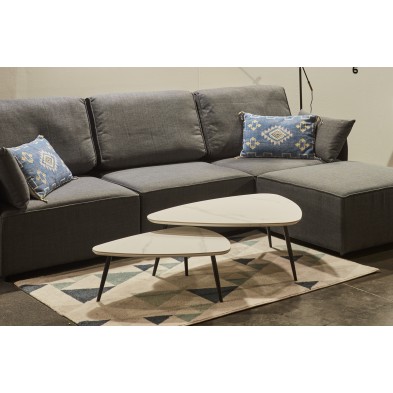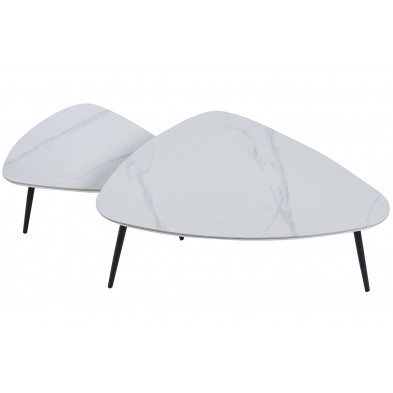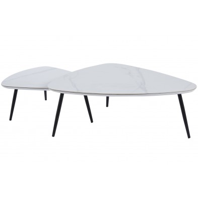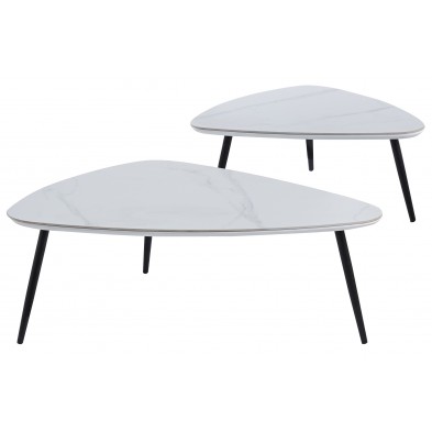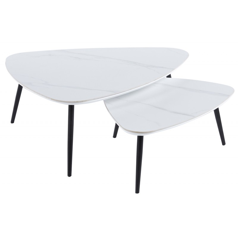 Mesa Centro Nido Ibiza, compuesto por 2 mesas a juego de diferentes tamaños, combinando la tapa en acabado cerámico color blanco con vetas y las patas metálicas en color negro. Ideales para colocar en cualquier rincón del salón. Las mesas están diseñadas para colocar de diferentes maneras, resaltan por su diseño original y estilo nórdico que encaja a la perfección con cualquier tipo de ambiente.