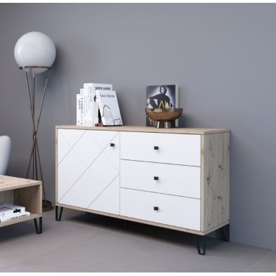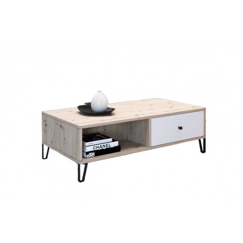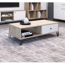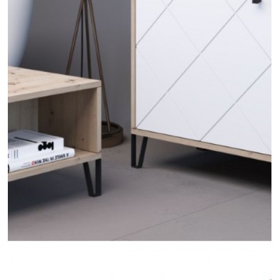 La Mesa de Centro Bilbo está fabricada en laminado sintético, combinando el roble artisan en estructura e interior y frente en blanco mate con grabados geométricos. Sus patas y tirador son metálicos en color negro. Compuesto por 1 cajón y estante. Podrás combinar con el resto de la colección disponible en nuestra web.