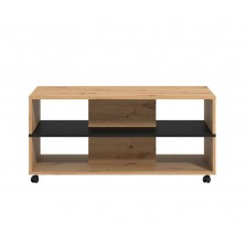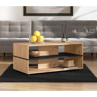 La mesa de centro Sica está fabricada en laminado sintético, con estructura en color roble artisan y balda central en color negro, ideal para poner multitud de objetos de uso diario. Es resistente a arañazos, golpes, altas temperaturas y humedad. Podrás tener un mueble de alta calidad a un precio excelente.