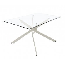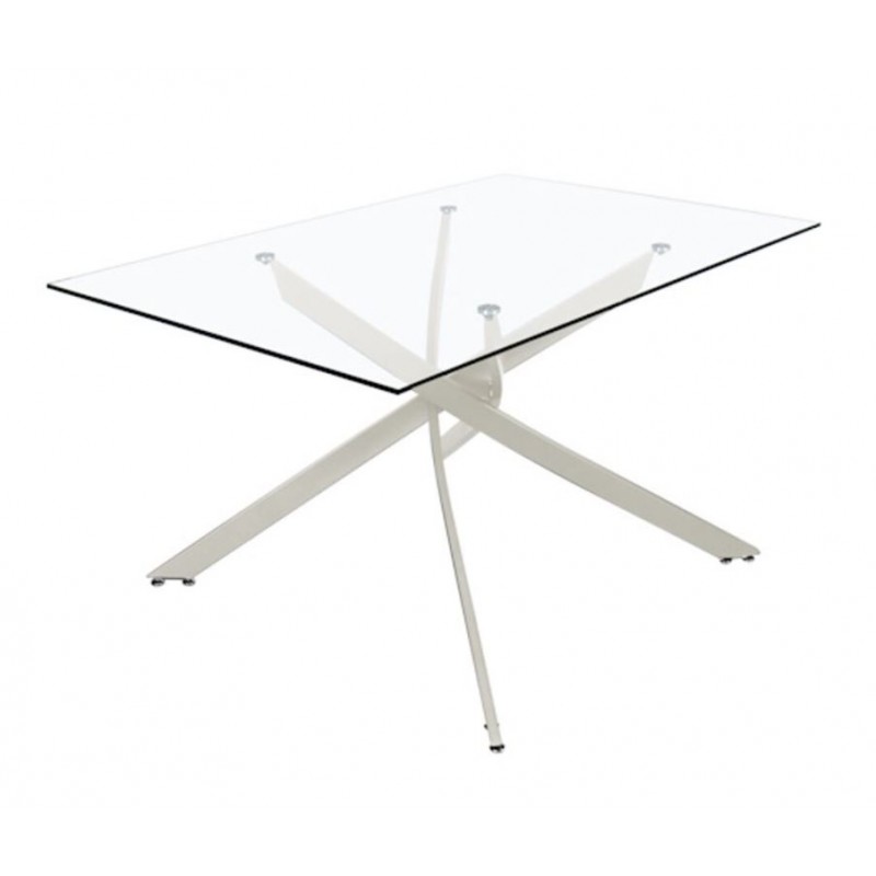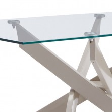 Mesa de Comedor Eri, con cristal templado de 10 mm de grosor y estructura metálica en color crema. La sujeción está realizada con láser. Compuesta por sus cuatro patas entrelazadas, que le dan originalidad y distinción respecto a las convencionales. Perfecto para gran variedad de comedores, su cristal transparente hará de tu ambiente un espacio más diáfano y luminoso.