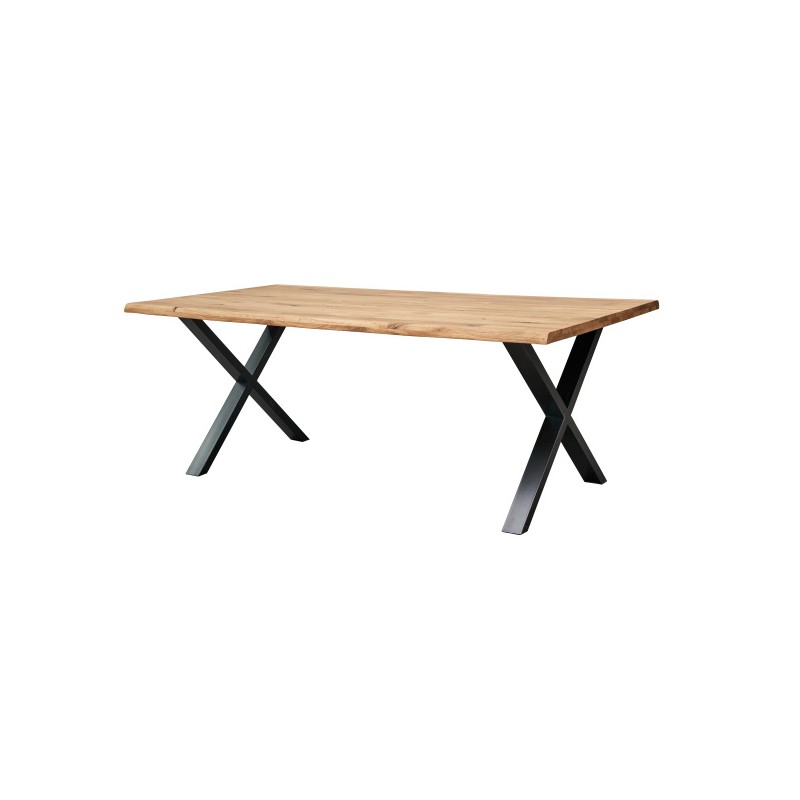 Mesa de comedor Karena, fabricada con materiales de primera calidad, madera en acabado roble con bordes ondulados aportando calidad a la tapa, y un grosor de 4 cm. La tapa es rectangular fija. Sus patas son metálicas en acabado negro, en forma de X. Gracias a los materiales con los que está fabricado aportan una fortaleza y resistencia inmejorable. Disponible en catálogo varias medidas y opciones de patas.