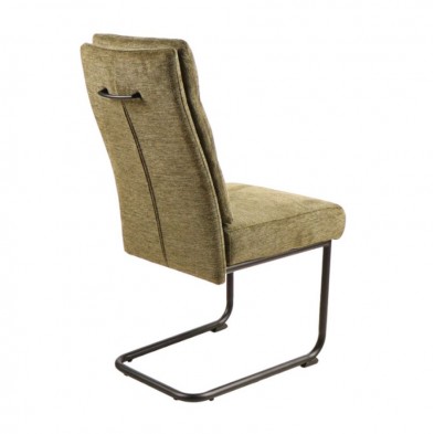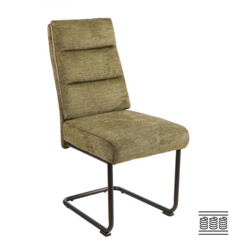 Silla de comedor Dana, tapizada en tejido verde musgo, el asiento cuentan con muelles, para darle mayor comodidad a la sentada y el respaldo con topper acolchado. Es una silla con alto grado de confort. En la parte posterior dispone de asa para facilitar el movimiento. Sus patas son metálicas tipo omega en color negro. Disponible en otros acabados en nuestra web. Ideal para comedores y salones de estilo moderno. Se vende en pack de 2 unidades.