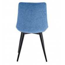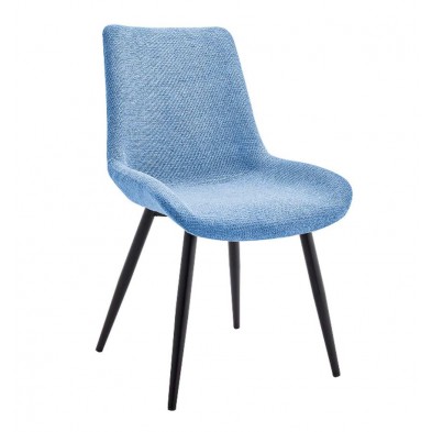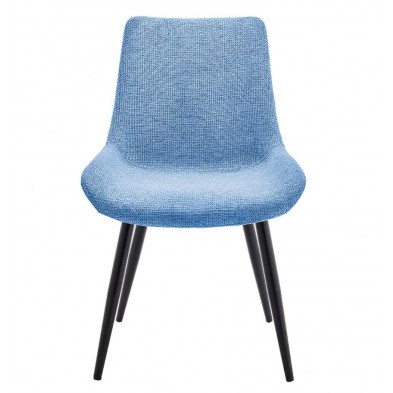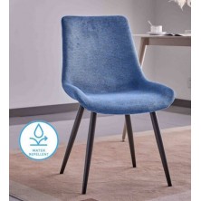 Silla de comedor Dere, tapizada en tejido azul con tratamiento repelente al agua. Es una silla confortable, con asiento reforzado y respaldo en una sola pieza. Sus patas son metálicas en color negro, con estructura fuerte y resistente. Disponible en otros acabados en nuestra web. Ideal para comedores y salones de estilo moderno. SÓLO se vende en pack de 4 unidades. PRECIO UNITARIO