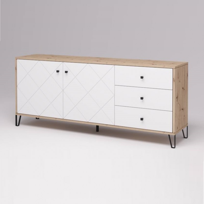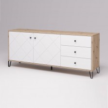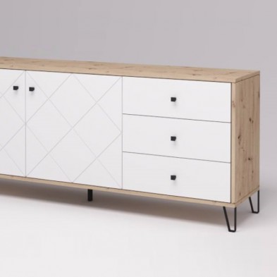 El aparador de salón Bilbo está fabricada en laminado sintético, combinando el roble artisan en estructura e interior y frentes en blanco mate con grabados geométricos. Sus patas y tiradores son metálicos en color negro. Compuesto por 2 puertas con apertura lateral y cajonera. Podrás combinar con el resto de la colección disponible en nuestra web.