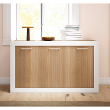 Aparador de salón Geminis, con estructura fabricada en color Natural, combinado Natural Rayado(sin textura), y detalles en blanco mate. Es un aparador con una excelente capacidad de almacenaje. Ofrece la posibilidad de modificar los colores de terminación, medidas o añadirle patas. Se sirve premontado.