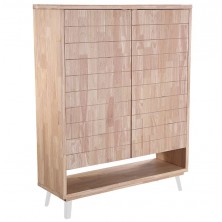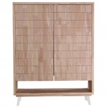 Consola alta de gran capacidad Berg, compuesta por 2 puertas y estantes en su interior, además tiene hueco decorativo en la parte inferior. Está fabricada en madera maciza laminada con chapa de Roble Nordish. El diseño de sus puertas es decorativo, con grabados lineales. El cierre de sus puertas es magnético, y sus patas son metálicas color blanco. Encaja en gran variedad de ambientes gracias a sus acabados.