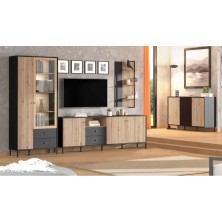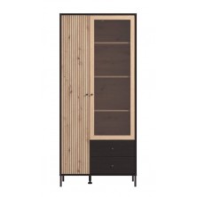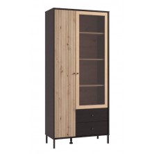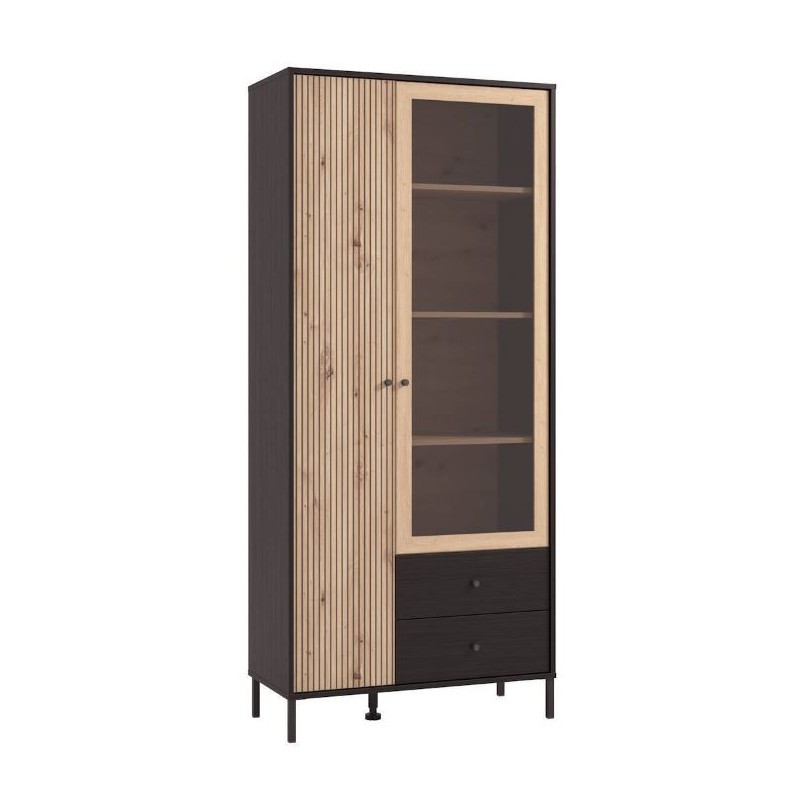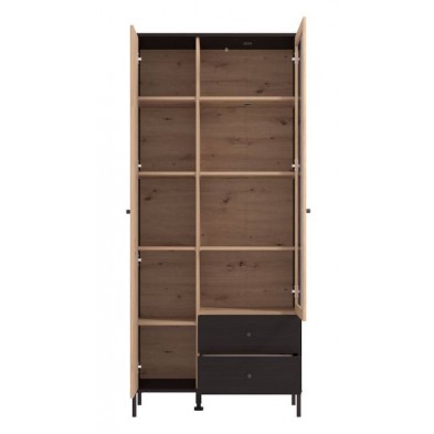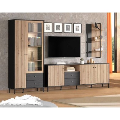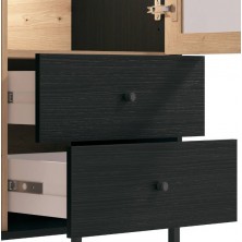 Vitrina Tania con estructura en acabado Ébano y detalles frontales con alistonados en Roble Artisan. Está fabricada en laminado sintético, los tiradores y las patas son de color negro. Compuesto por puertas y 2 cajones. Diseño moderno y actual, fácil de combinar gracias a sus acabados.